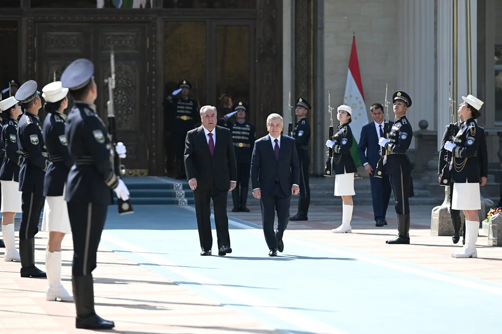 Меҳмони олимақом - Президенти Ҷумҳурии Тоҷикистон муҳтарам Эмомалӣ Раҳмонро Президенти Ҷумҳурии Узбекистон муҳтарам Шавкат Мирзиёев гарму самимӣ истиқбол гирифта, ба болои шоҳсуфаи ифтихорӣ даъват намуданд.
